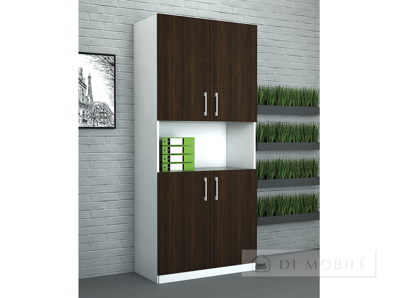 Благодаря своим просторным отделениям обеспечивает достаточно места для хранения всех вещей, включая документы, папки, книги и другие предметы. Шкаф имеет открытую полку и две закрытые секции.