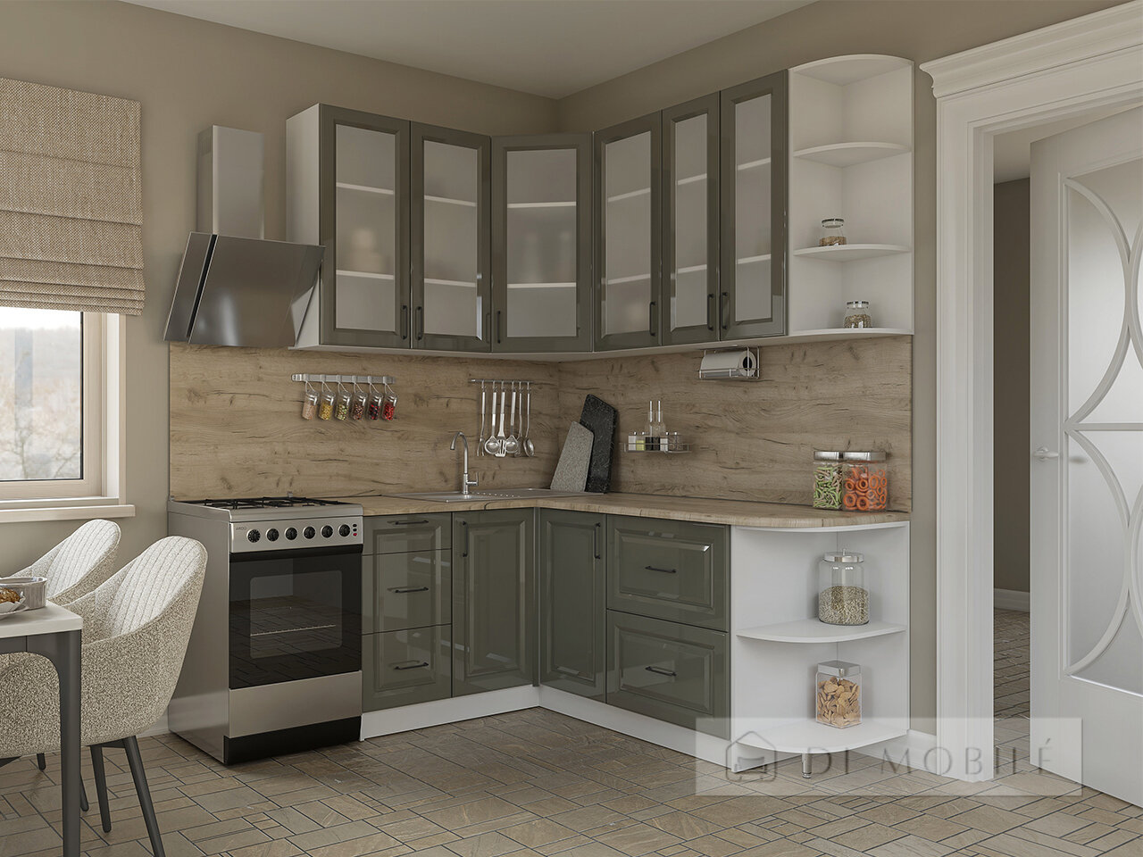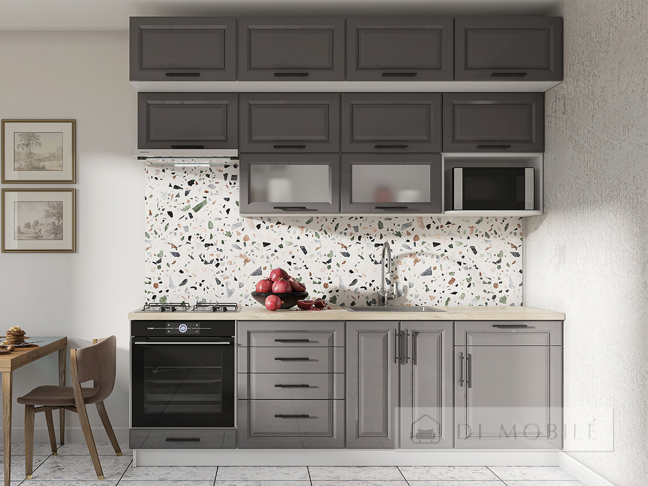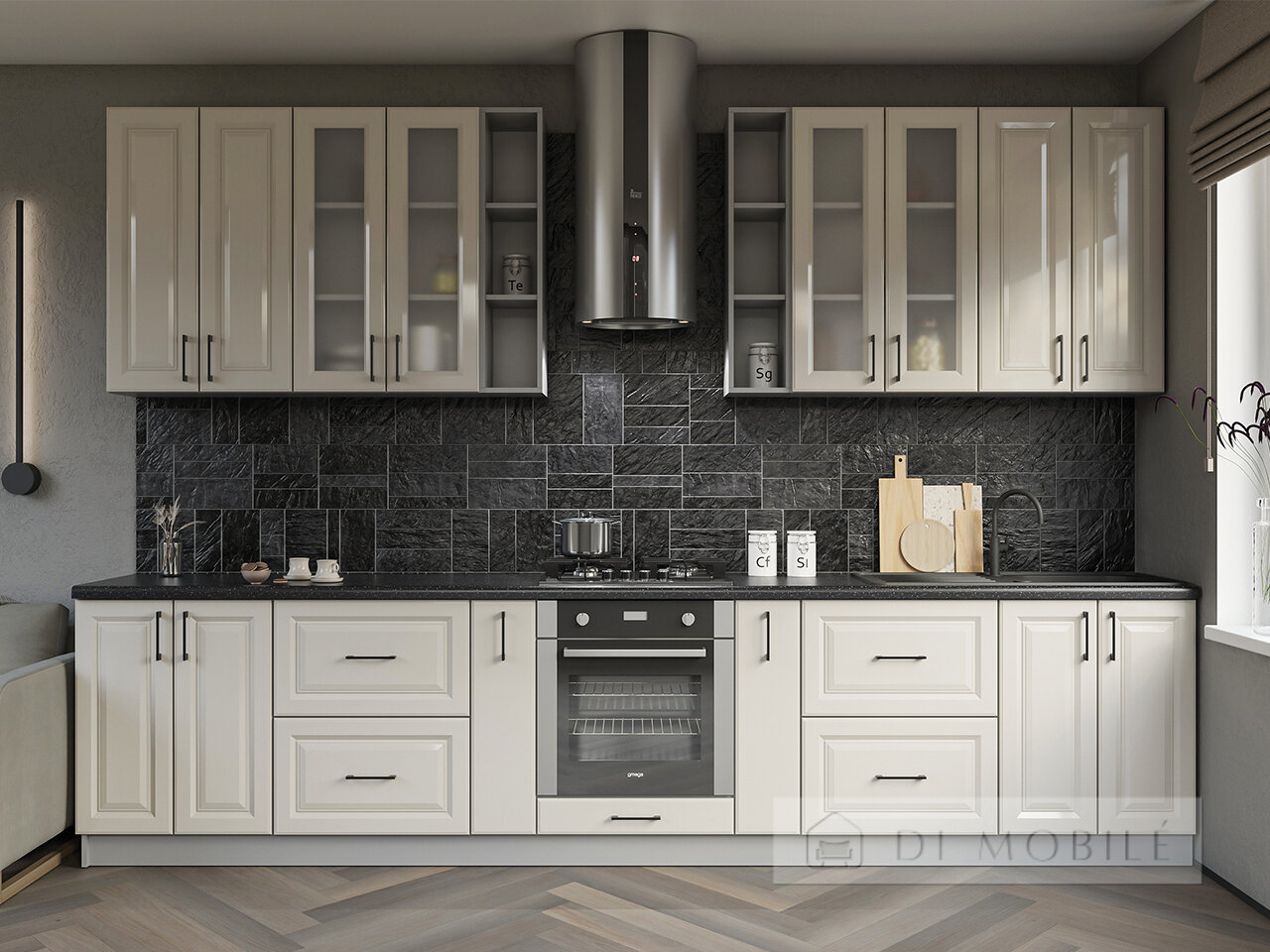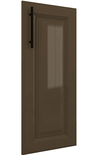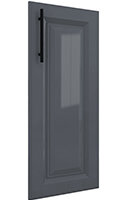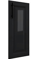 | Фасады с витриной: крашеный МДФ 16 мм + стекло сатин или металлическая черная рамка + графитовое стекло |