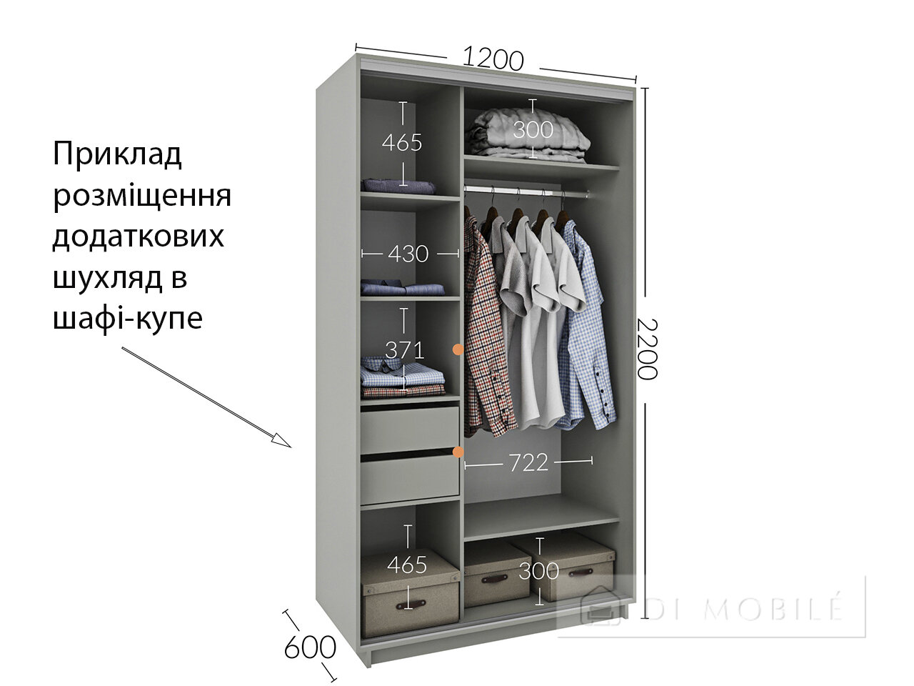 Important!Pentru rafturi suplimentare: rafturile cu fitinguri nu sunt completate, burghie pe rafturi şi pereţii dulapului nu sunt furnizate, deoarece producătorul nu îşi poate cunoaşte locul de instalare în avans şi sunt montate la discreţia cumpărătorului la asamblarea mobilei. Vă recomandăm utilizarea serviciilor unui constructor experimentat.